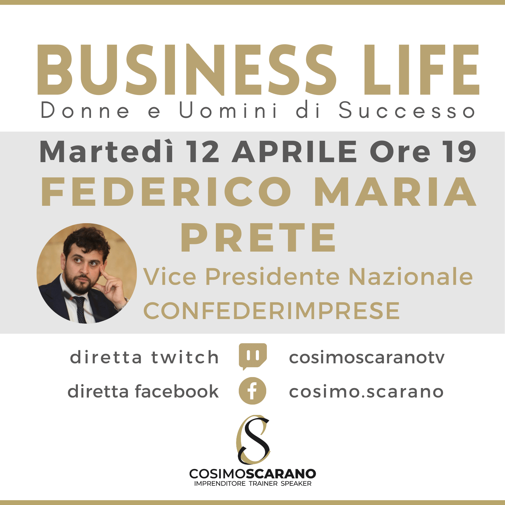 Federico è il Vice Presidente Nazionale di Confederimprese, verrà intervista in diretta Facebook da Cosimo Scarano